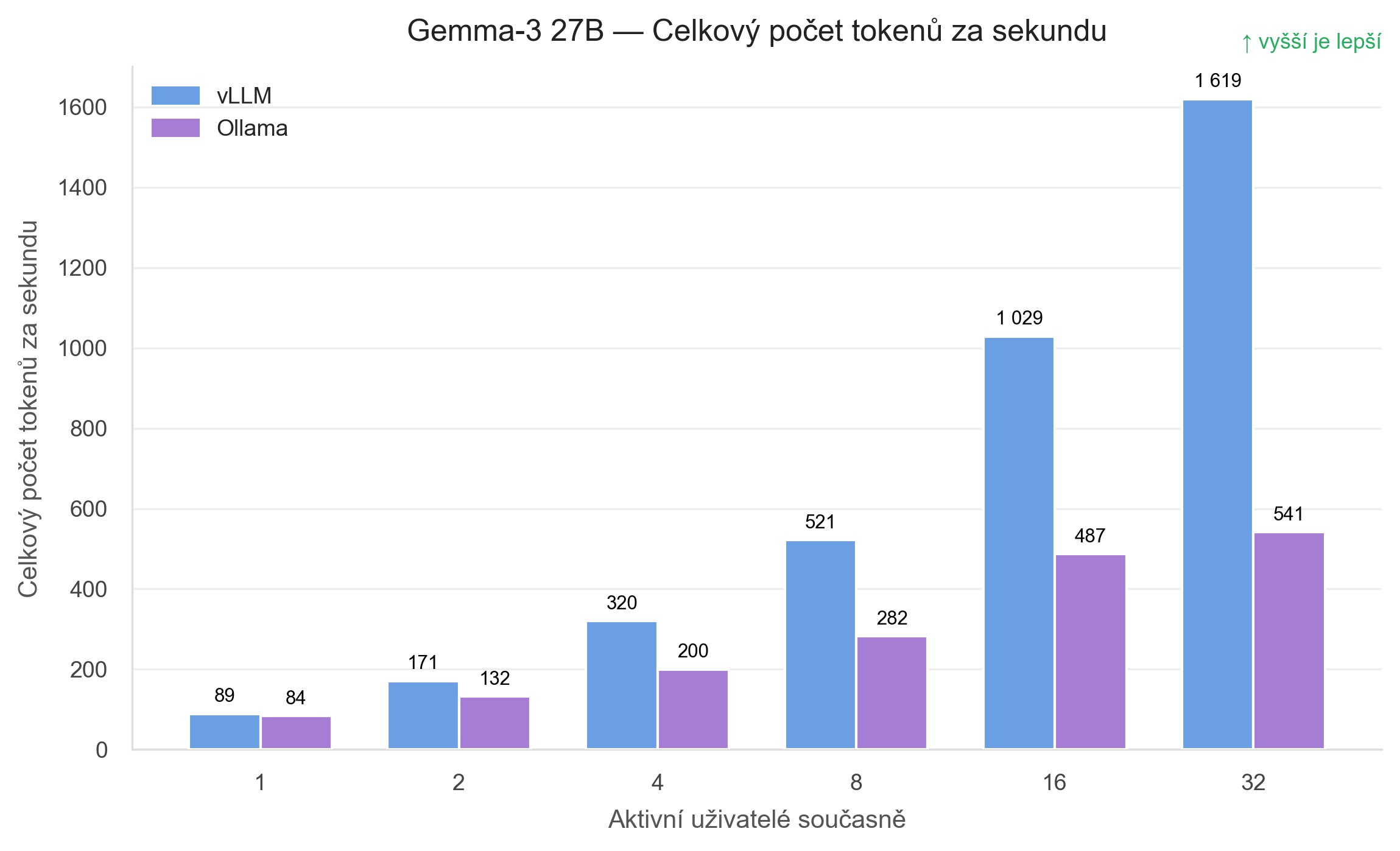 U Gemma 3 27B dochází ke stejnému efektu jako u GPT OSS 120B. vLLM roste z 89 TPS na 1 619 TPS, zatímco Ollama zůstává na 541 TPS. To znamená, že vLLM při 32 uživatelích doručuje přibližně 3× vyšší celkový výkon.
