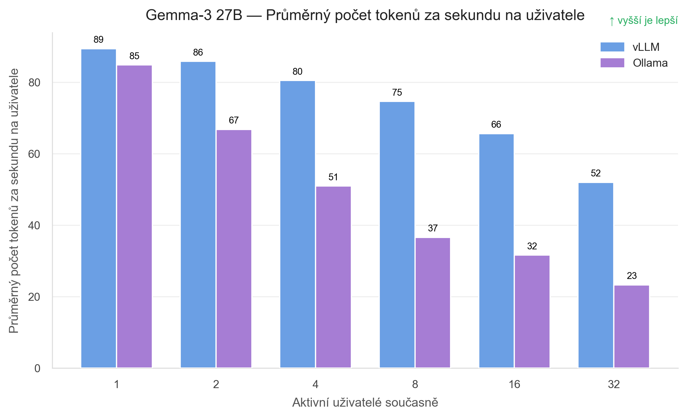 vLLM klesá z 89 tokenů za sekundu na 52 tokenů za sekundu, což je při 32 uživatelích stále velmi solidní výsledek. Znamená to, že i při vysoké souběžnosti si každý klient udrží rozumnou rychlost generování.