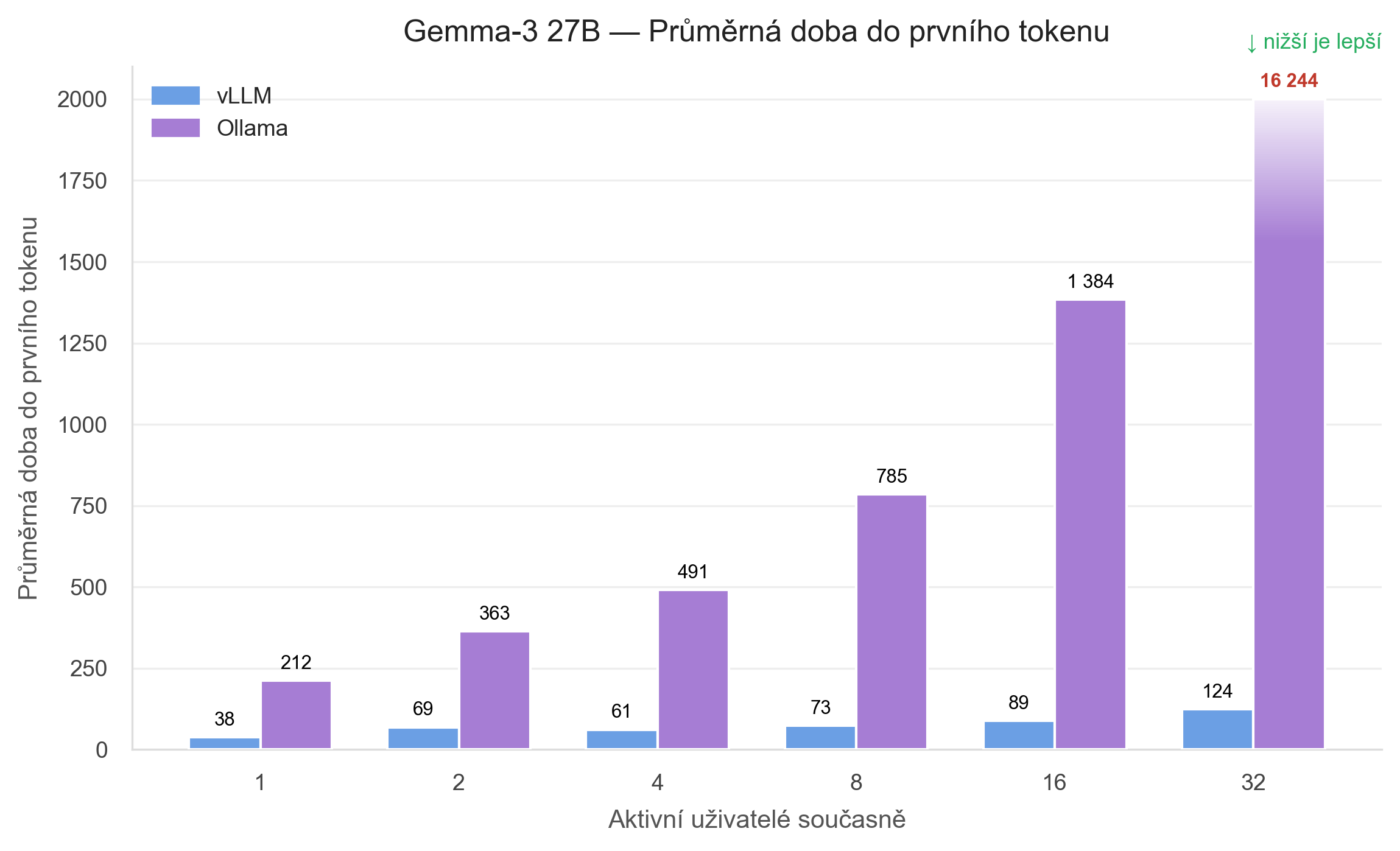 Ollama jde z 212 ms na extrémních 16 244 ms při 32 aktivních uživatelích. To už není jen vyšší latence, ale zcela jiná uživatelská zkušenost. Ve chvíli, kdy jeden request čeká na první token přes 16 sekund, začíná být služba pro interaktivní použití problematická.