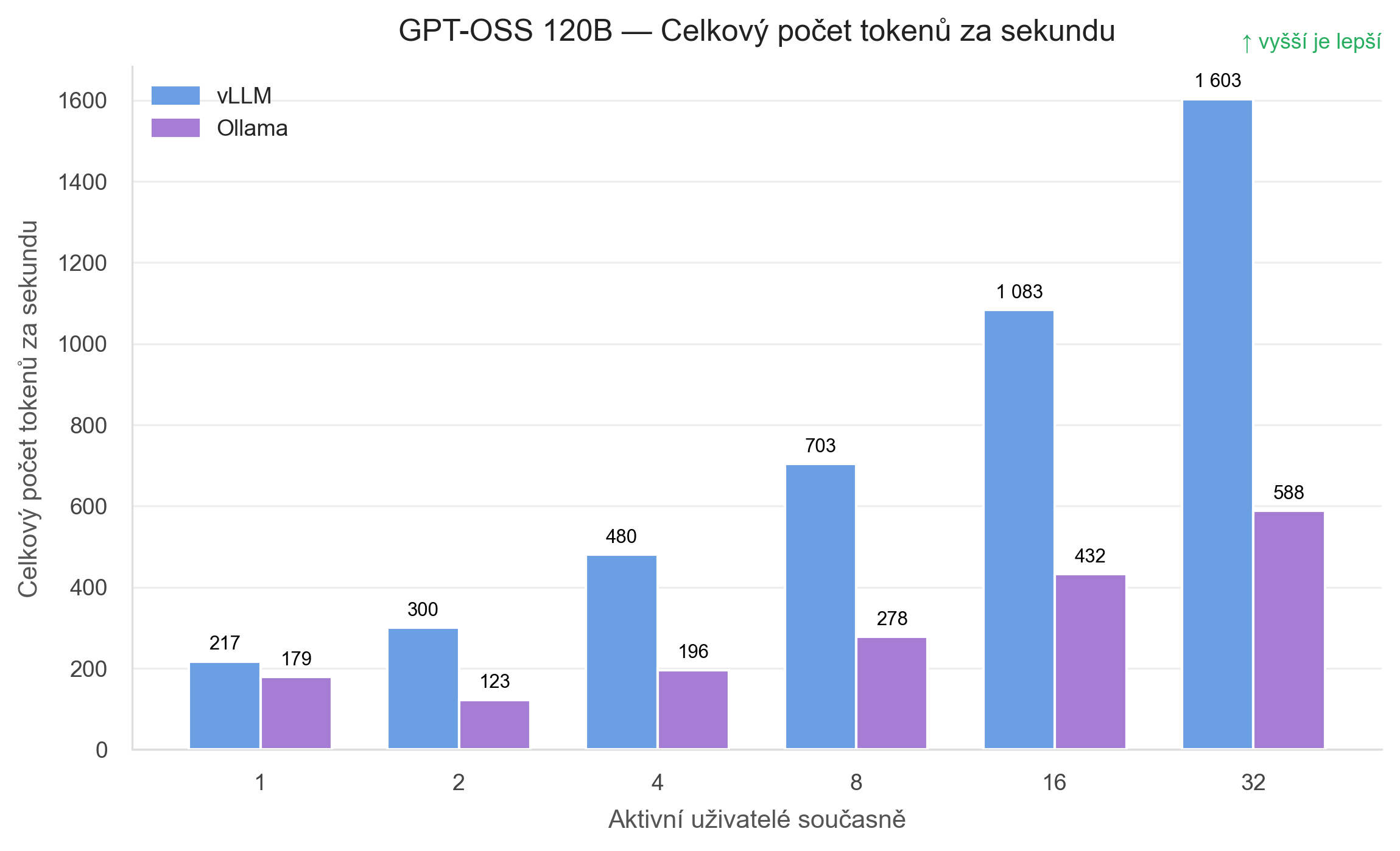 Ollama se z 179 TPS dostane jen na 588 TPS. Jinými slovy, při 32 aktivních uživatelích dává vLLM zhruba 2,7× vyšší celkový výkon. Pro produkční API je to rozdíl, který se promítne do ceny za jeden obsloužený request i do počtu uživatelů, které zvládnete obsloužit na jednom GPU.