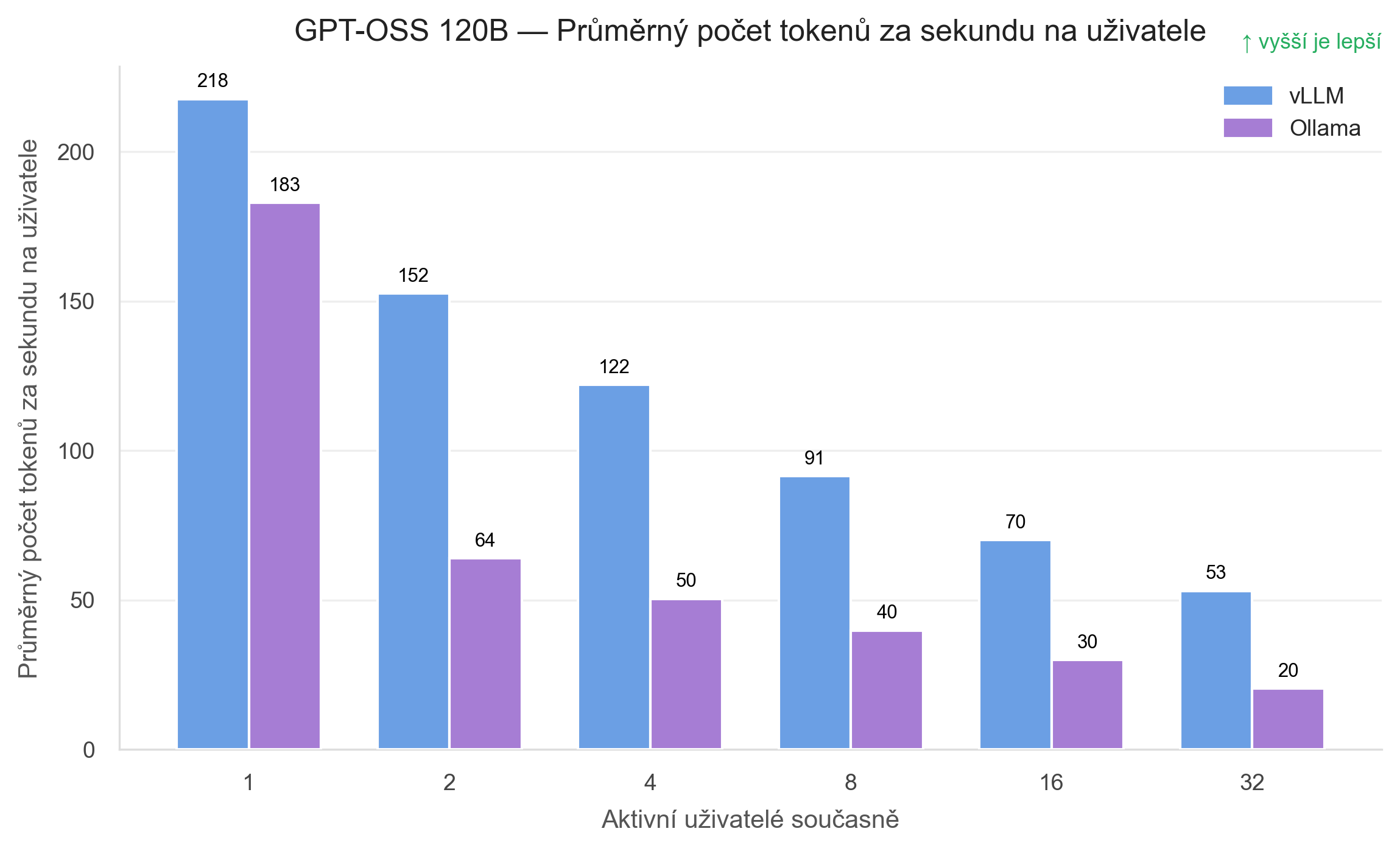 vLLM sice s růstem počtu uživatelů logicky ztrácí část výkonu na jednoho klienta, ale zbylý výkon na jednoho klienta zůstává stále dobře využitelný. Z přibližně 218 tokenů za sekundu při jednom uživateli se dostává na 53 tokenů za sekundu při 32 uživatelích. To je pořád hodnota, se kterou lze provozovat svižné API.