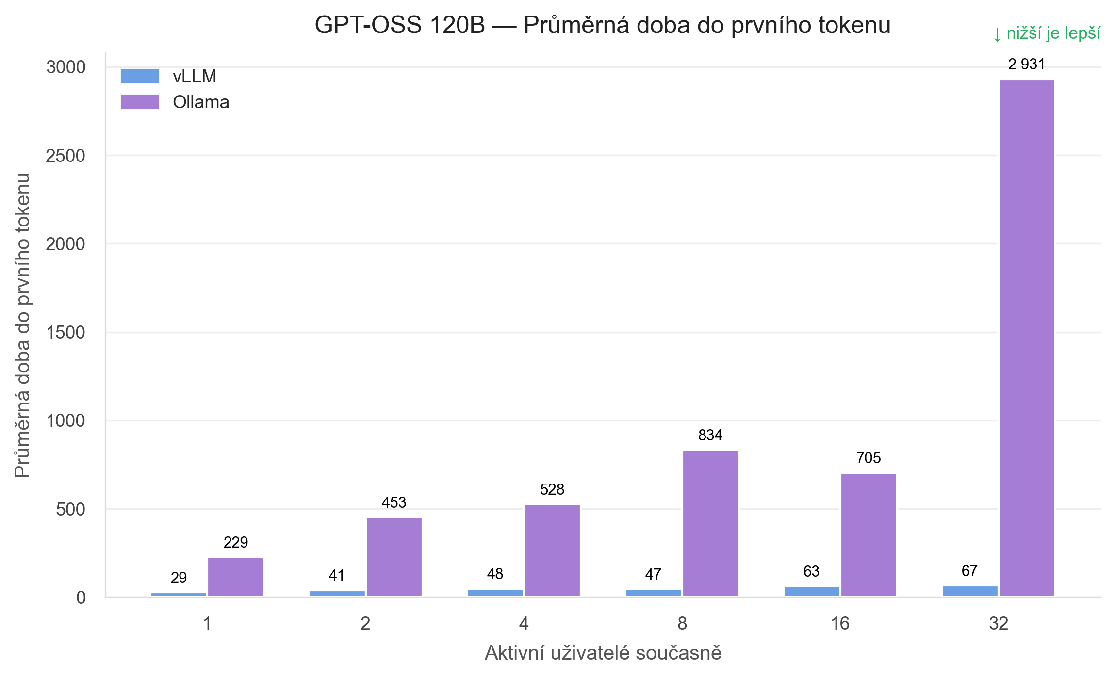 Ollama začíná už při jednom uživateli na 229 ms, při 8 uživatelích je na 834 ms a při 32 uživatelích stoupá na 2 931 ms. V praxi to znamená, že zatímco vLLM stále reaguje téměř okamžitě, Ollama už při vyšší zátěži působí jako služba, která před odpovědí dlouho čeká.
